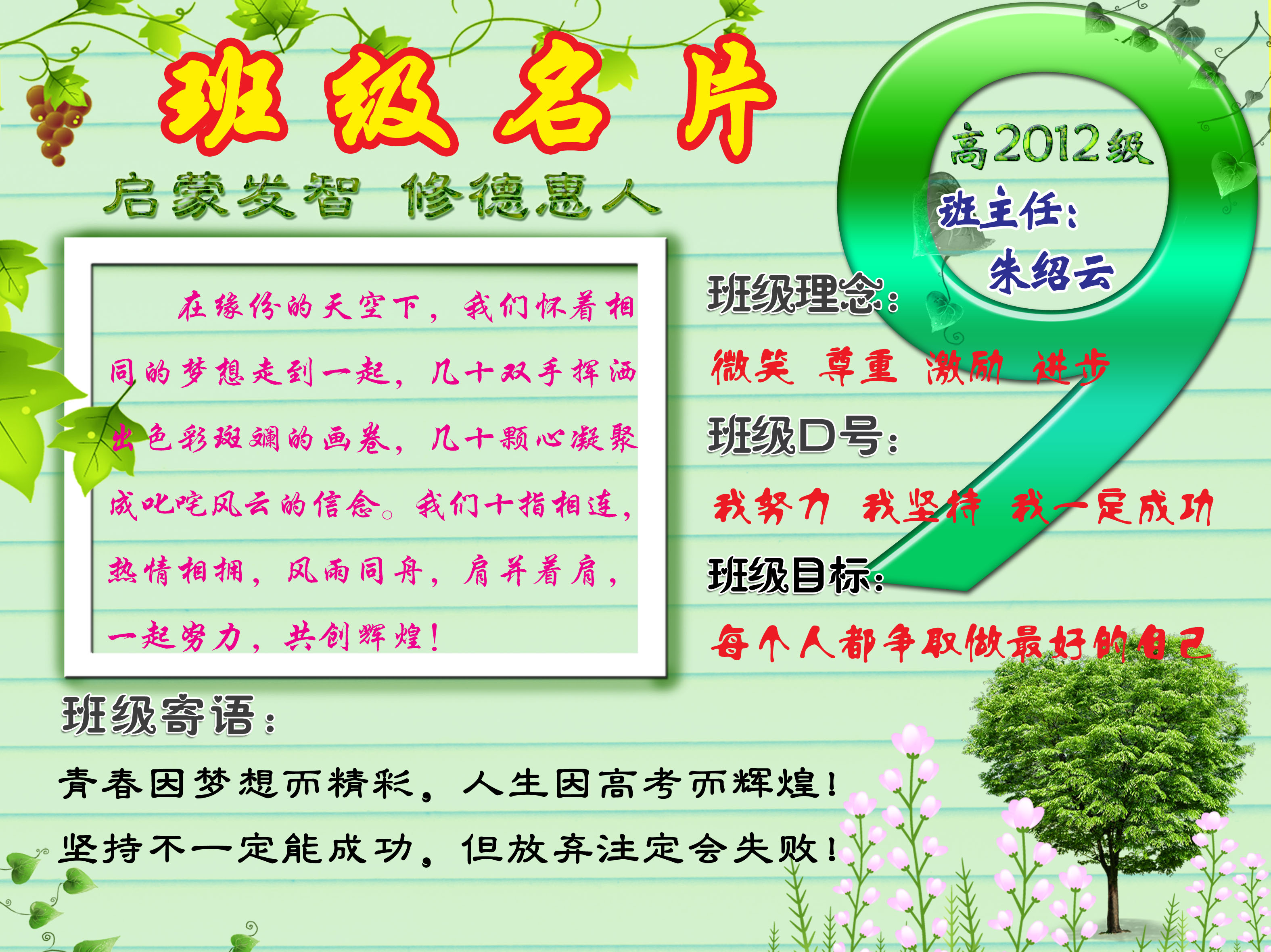 上面包含了班徽、班训、班级口号、班级目标、班级寄语等内容。上面绿色的数字9就代表九班,中间的高2012级就代表高二,加起来就是高二(9)班,绿色代表青春与活力。班级理念也就是本班的班训,我们将“微笑、尊重、激励、进步”作为本班班训,我借鉴了其他老师的这句话“我努力,我坚持,我一定成功”作为本班的班级口号,我们的目标是:“每个人都争取做最好的自己”,我们的学生虽然基础差,但每个同学都有他自己的闪光点,希望在这里每个学生都发现自己的闪光点,争取做他最好的自己。下面这两句“青春因梦想而精彩,人生因高考而辉煌”是班级寄语,也可以说是班主任寄语,也就是班主任想对学生说的话。中间紫色的这部分是班级宣言:......