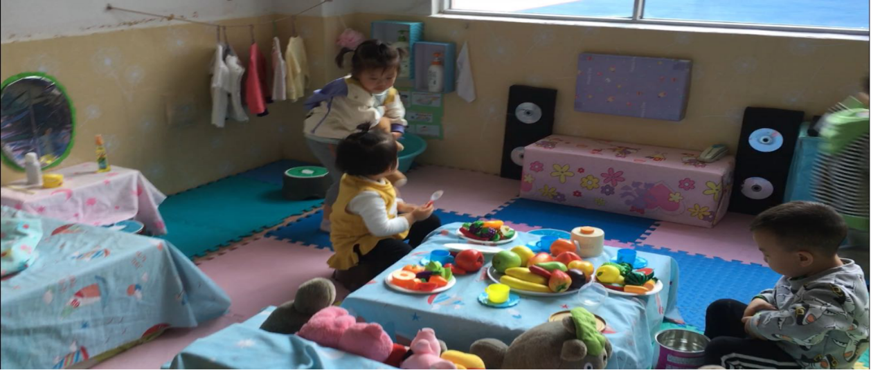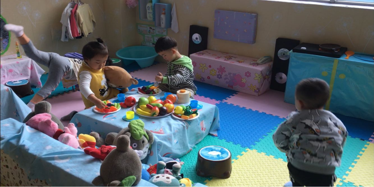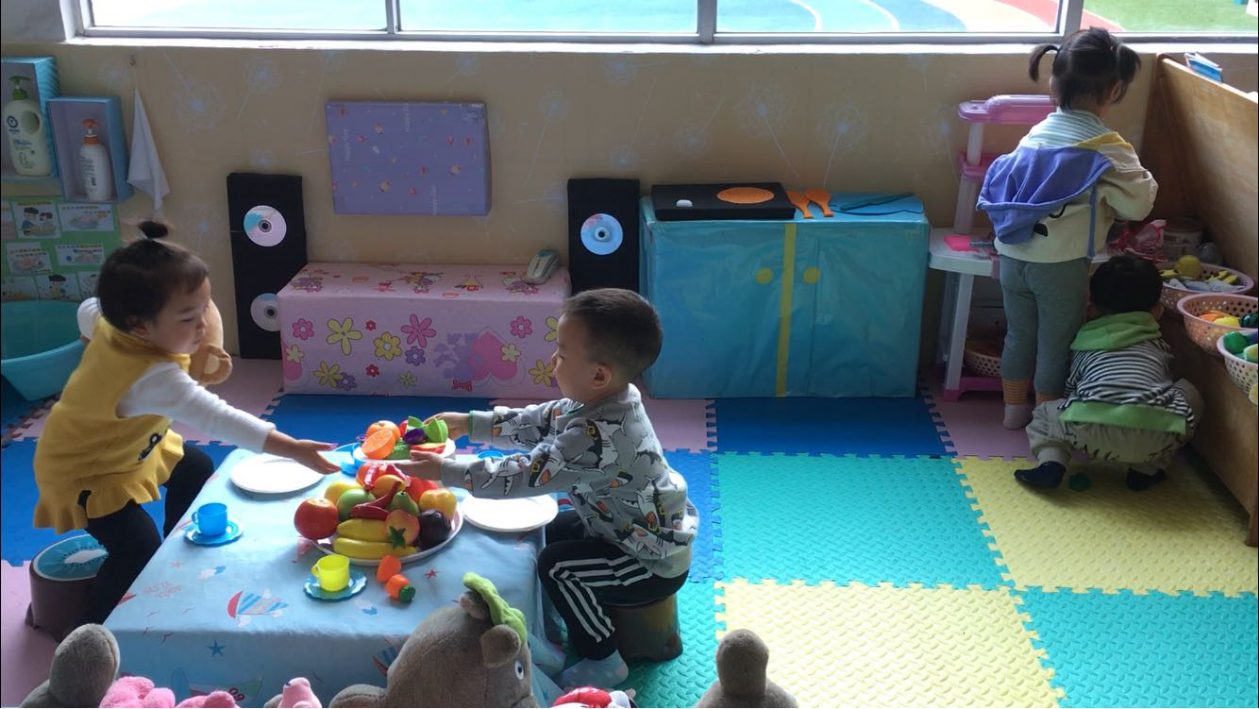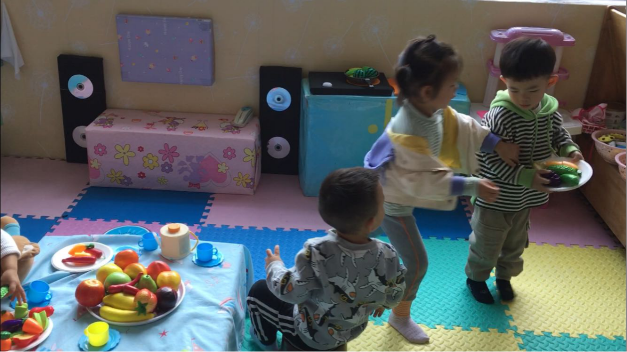 思彤把娃娃还给了博惠后就坐在地上不动了,这时候看见对面的梓康在一边地上做一些奇怪的动作,好像做俯卧撑一样,思彤觉得很好玩,也跟着学起了动作。而在桌子旁边的博惠和均博一直沉浸在自己的角色当中,一直在喂娃娃、照顾娃娃。