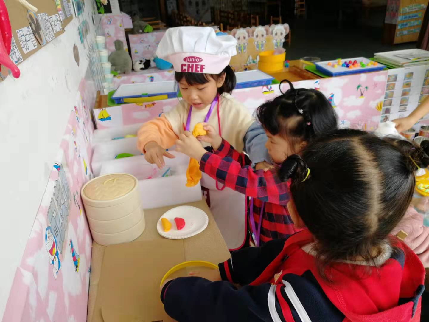 眼看着顾客们用餐快结束了,孩子们却不想那么快结束游戏,刘奕佳想了想,拿起边上的橡皮泥揉揉捏捏准备做饺子,并对曾雅萱说:“你去问问顾客们想不想吃饺子,有各种口味的哦!萝卜、草莓、青菜馅的。”顾客们听了以后,都说想吃,点了许多,但厨房这边可着急了,一个人哪里做的来这么多的饺子,于是,收银员、服务员都投入到了做饺子的队伍当中。