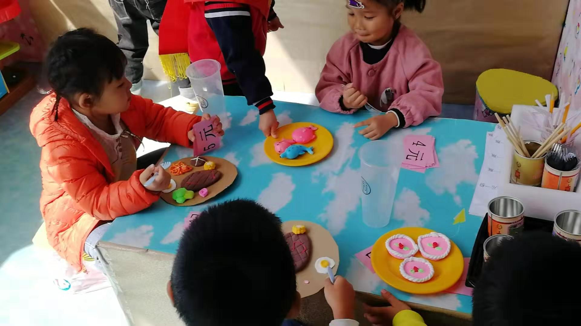 《兔兔花园餐厅》是我们新开设的活动区,我们运用粘土、不织布、卡纸等物品制作了一些餐厅所需要的食物、收银台、餐桌等。同时我们也请家长配和收集了一些必备的餐盘、筷子、菜刀等厨房用具。起初,新布置好的区角以及丰富的活动材料非常吸引孩子们,引起了他们极大的兴趣,也带给了他们游戏的快乐,每次活动会有7名孩子进入,一名幼儿扮演收银员,一名幼儿扮演服务员,一名幼儿扮演厨师,剩下的三名幼儿扮演顾客。在游戏中,他们试着模仿生活中这些真实的场景:服务员主动在门口迎接顾客,并安排就坐,与之交谈询问需要的食物、饮品,再将顾客选择好的菜单交给厨师,厨师即按要求开始做菜,服务员偶尔会过去帮忙,最后用餐结束,顾客再到收银台结账。