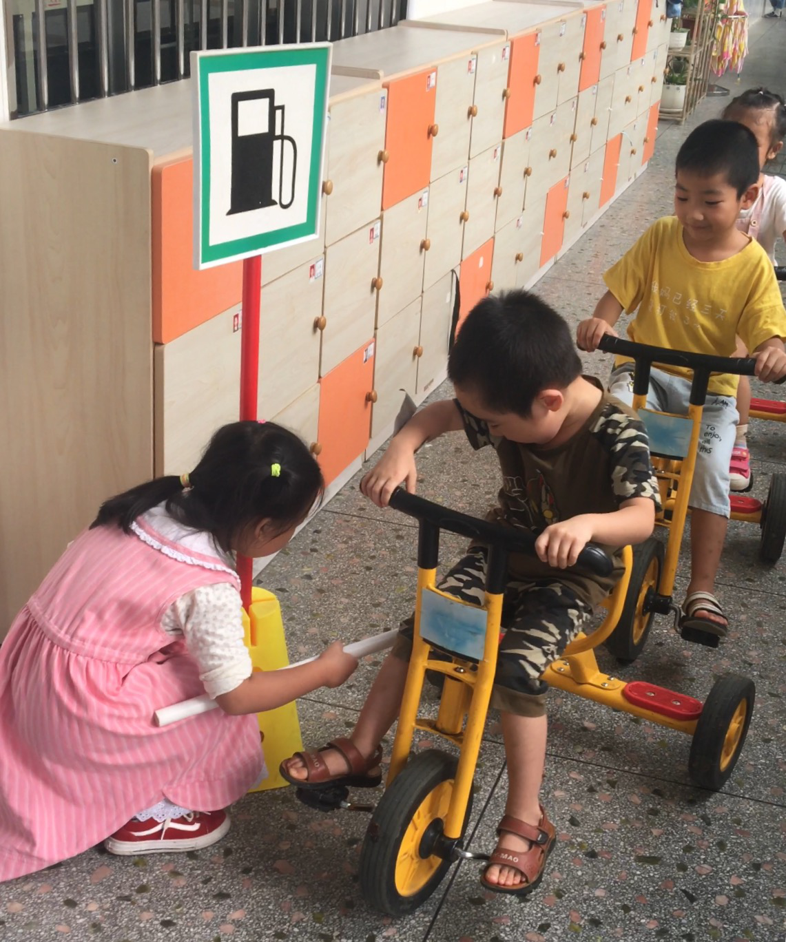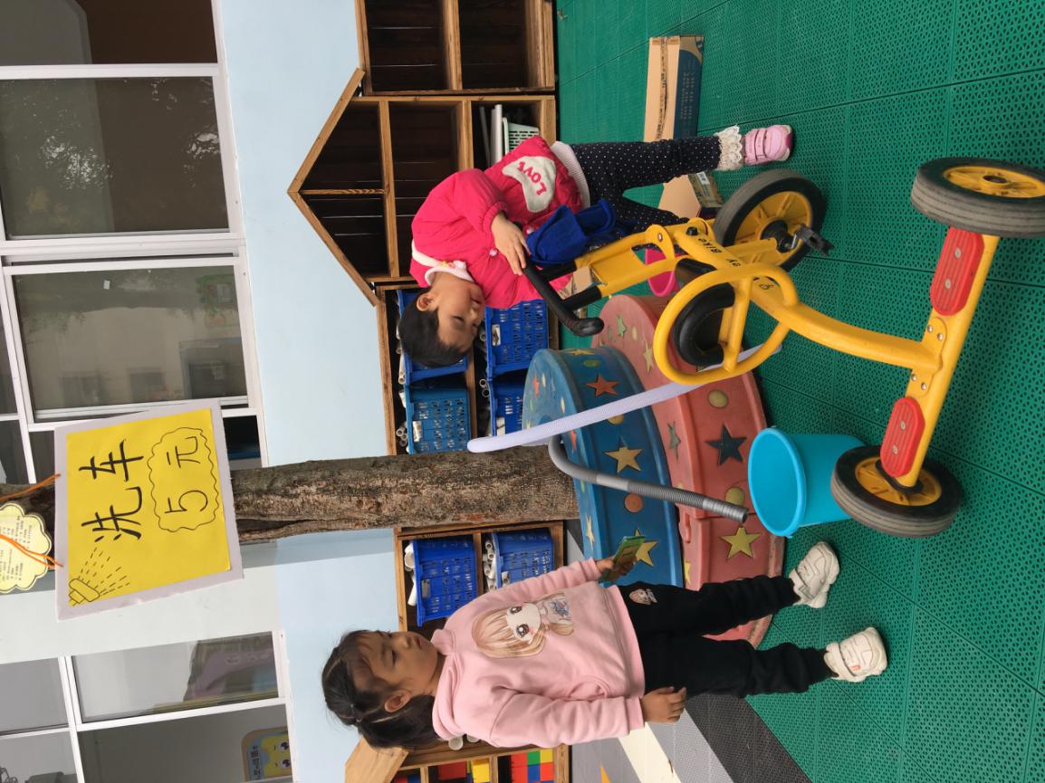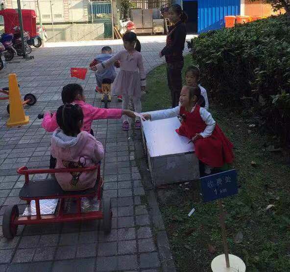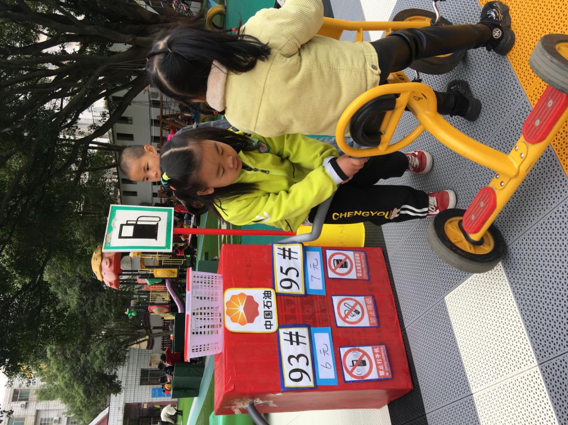 孩子们快乐地骑着小车,他们来到加油站,Lisa小朋友热情地询问:“你要加油吗?”。一开始,她的声音很小,我对她说:“Lisa,你的声音大一点,小朋友才能听见哦。”Lisa接受了我的建议,再有小朋友来加油的时候,她会大声的询问:“你需要加油吗?”,同时她也提醒小朋友说话大声点。有的小朋友说:“好啊,来啊,我要加油。”Lisa就蹲下来,给小朋友加油,也有的小朋友说:“我不需要加油。”全部小朋友骑车过去了,Lisa又非常有礼貌的跟大家说再见。