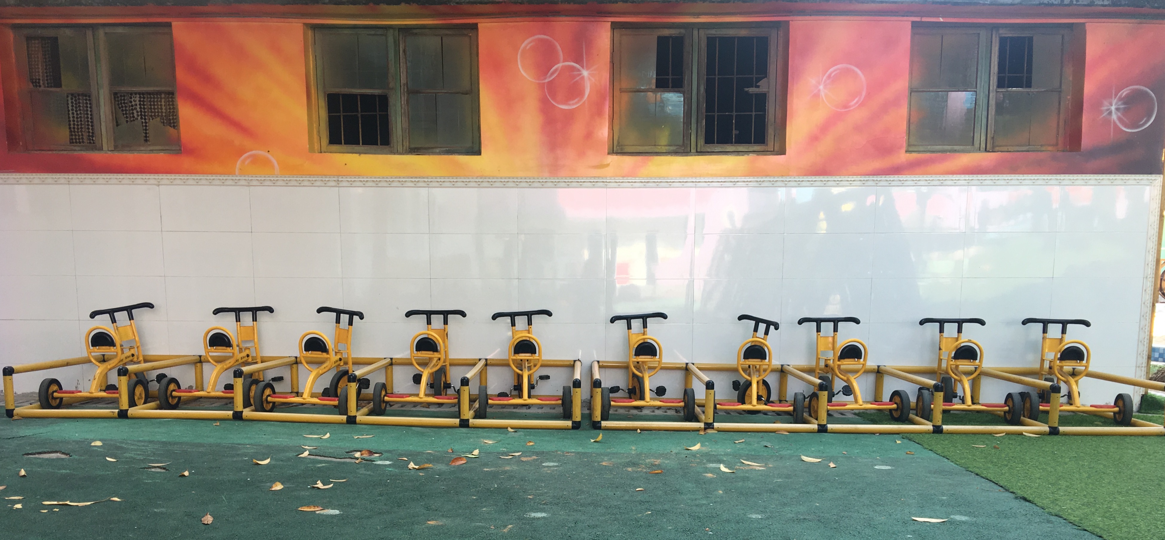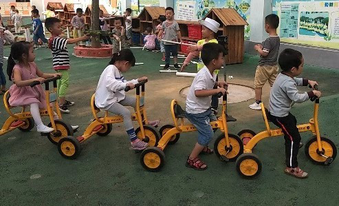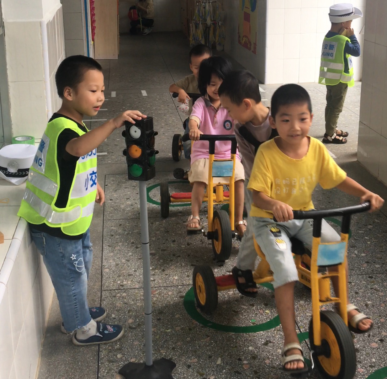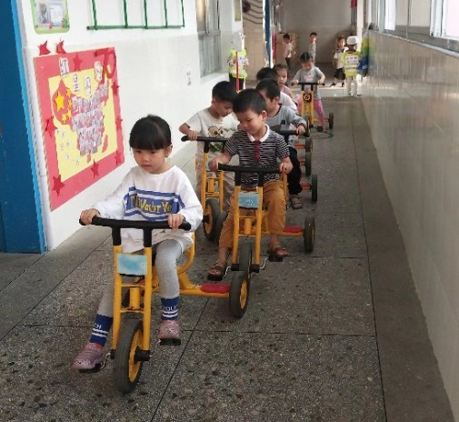 孩子在骑行区玩耍,分别找到自己钟爱的小车,开上了模拟马路,置身于真实的交通环境中,骑着自行车的孩子把自行车骑上了机动车道,而手推车则上了非机动车道。有的孩子当交警,有的孩子当司机。不一会,张毅跑过来说:“老师,蓝文杰开错了道。”这边张毅刚走,点点又来报告:“老师,李哲睿逆向行驶了,我告诉他走错了,他也不听我的”小交警无法处理这些事情,于是,我一会儿跑这帮忙,一会儿去那处理问题,一个上午下来,老师特别累,“小交警”无法发挥作用。