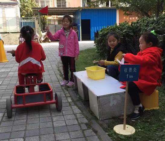 孩子们骑着小车经过收费站,金金说:“要给钱,收费、收费”,孩子们从口袋里掏出钱缴费,顺利通过收费站。