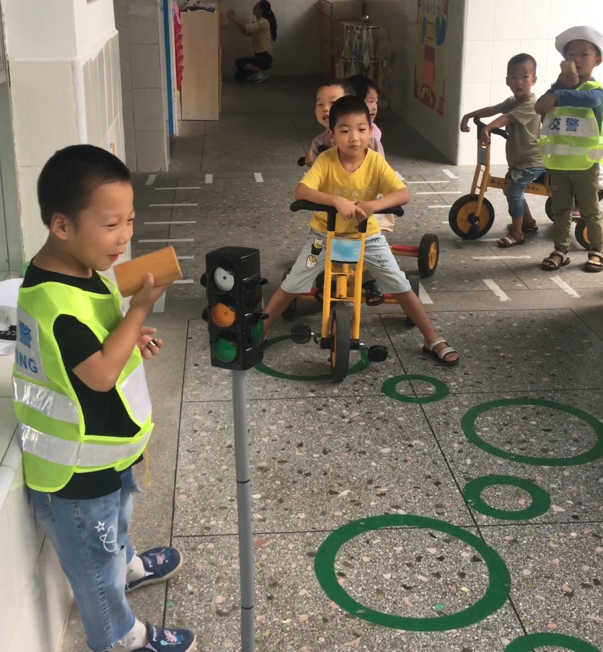孩子们就开始游戏活动了,有的小朋友充当路人,有的小朋友充当司机,有的小朋友充当交警叔叔。