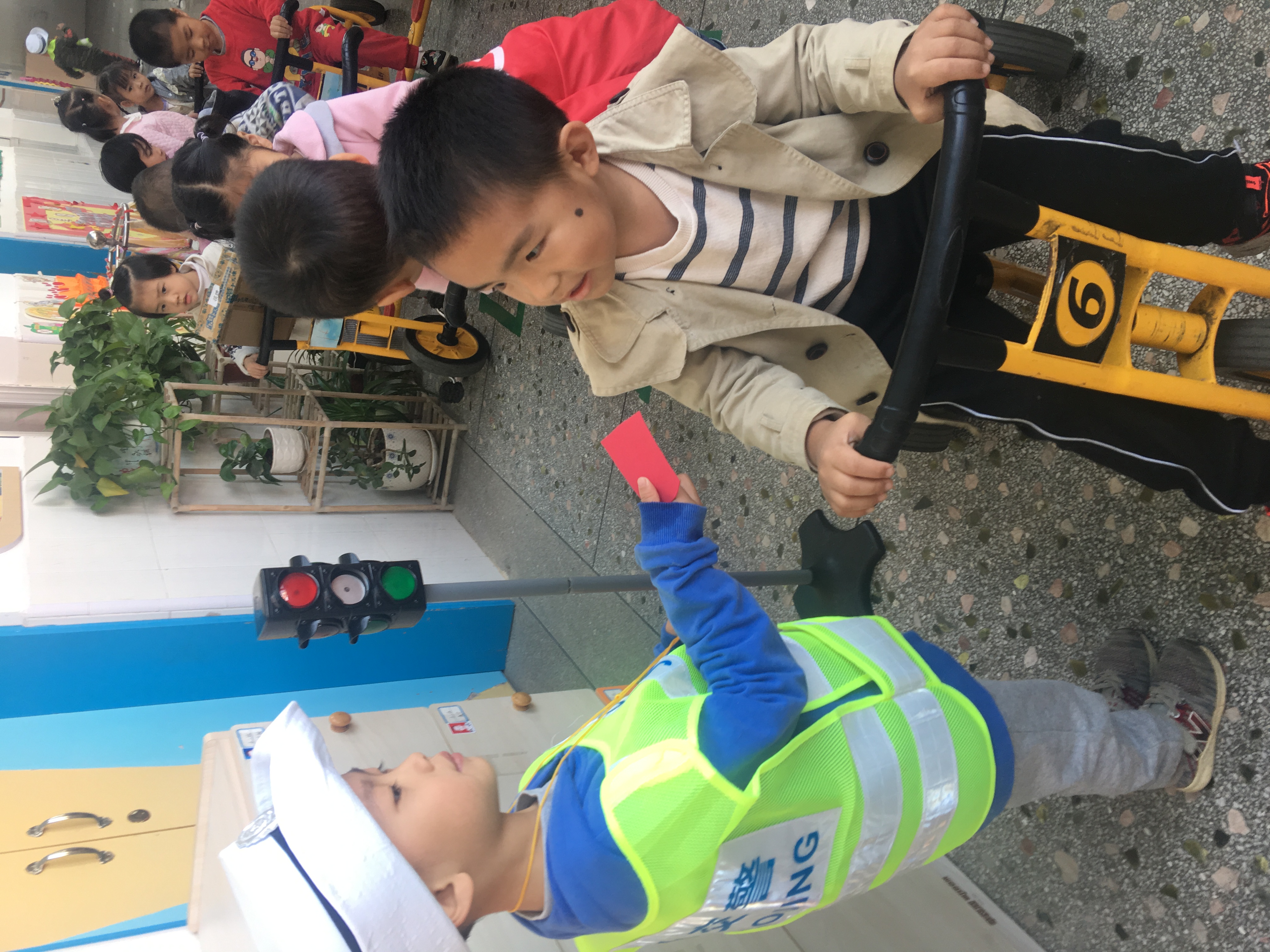 接下来的游戏,老师给交警培训,给了他们红牌和黄牌,讲了红牌黄牌的作用,但是没有提醒孩子谨慎用红牌,结果不停有人骑着车到我这里来学习: