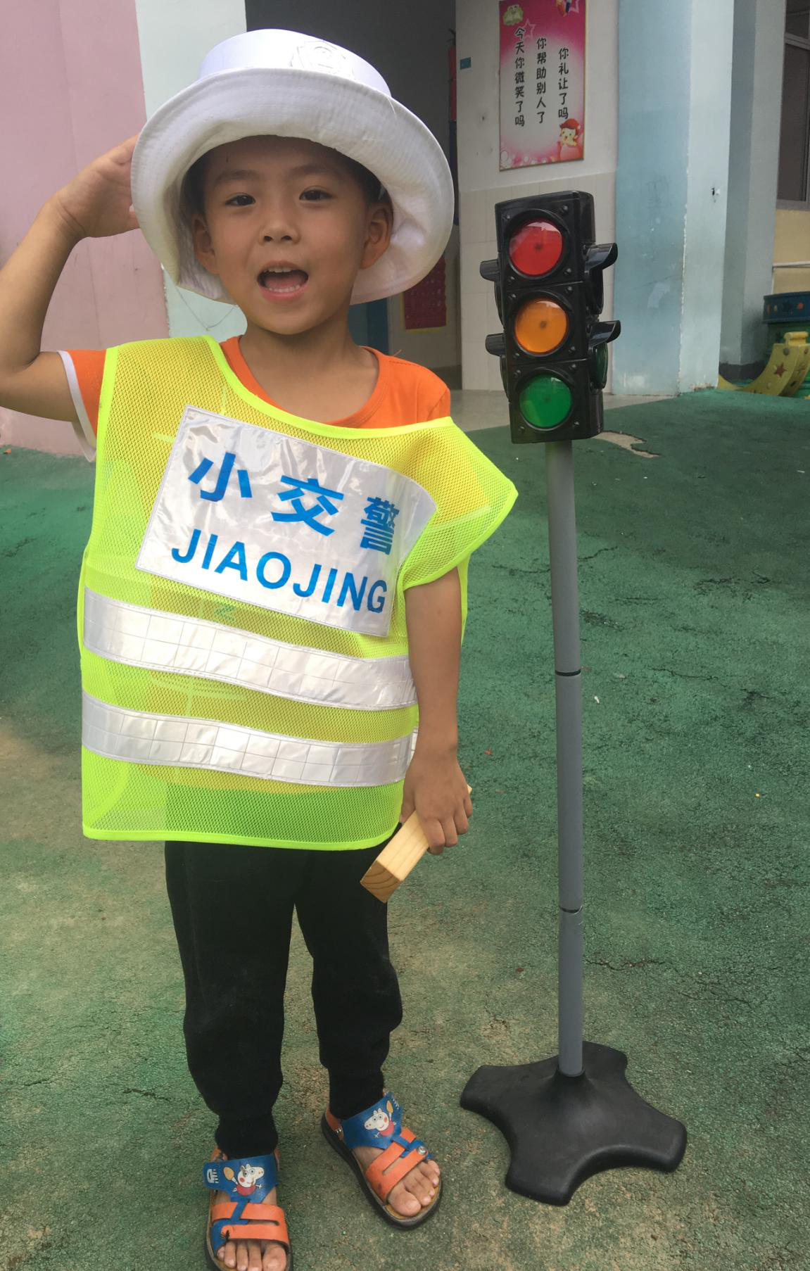 点点说:“交警可以拿红牌和黄牌,不遵守交通规则的就发红牌给他”