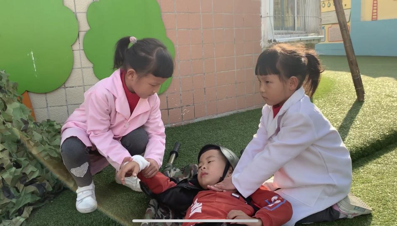 在与幼儿讨论之后,又拓展了更多的游戏玩法及规则。小马看见敌人的炮火轰炸过来,立马蹲下、躲进战壕,等待对方火力减小了,再偷偷露出半个身子,伺机出动偷袭对方。可就在这时,敌方的手榴弹打中了小马,他立马倒下,救援小队浩浩和杰杰在战友们的火力支持下,迅速将小马抬到“战地医院”,彤彤医生、乐乐护士马上对伤员展开急救,彤彤就拖着伤员的腿,直接拿起他的脚,在脚上进行挂药水。在我语言提醒后,她们开始做基本的心肺复苏按压,和包扎伤口,小马很快就醒了。又继续投入到战斗中去了。游戏如火如荼的进行着,不一会儿,炸弹投完了,对战时间大概持续了10分钟。