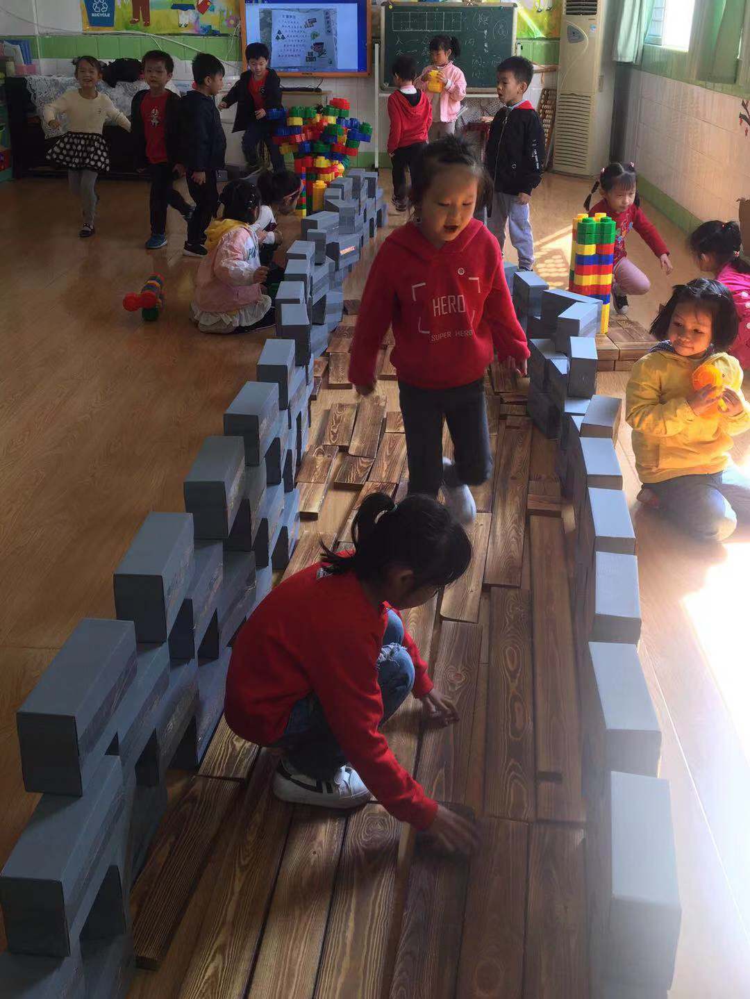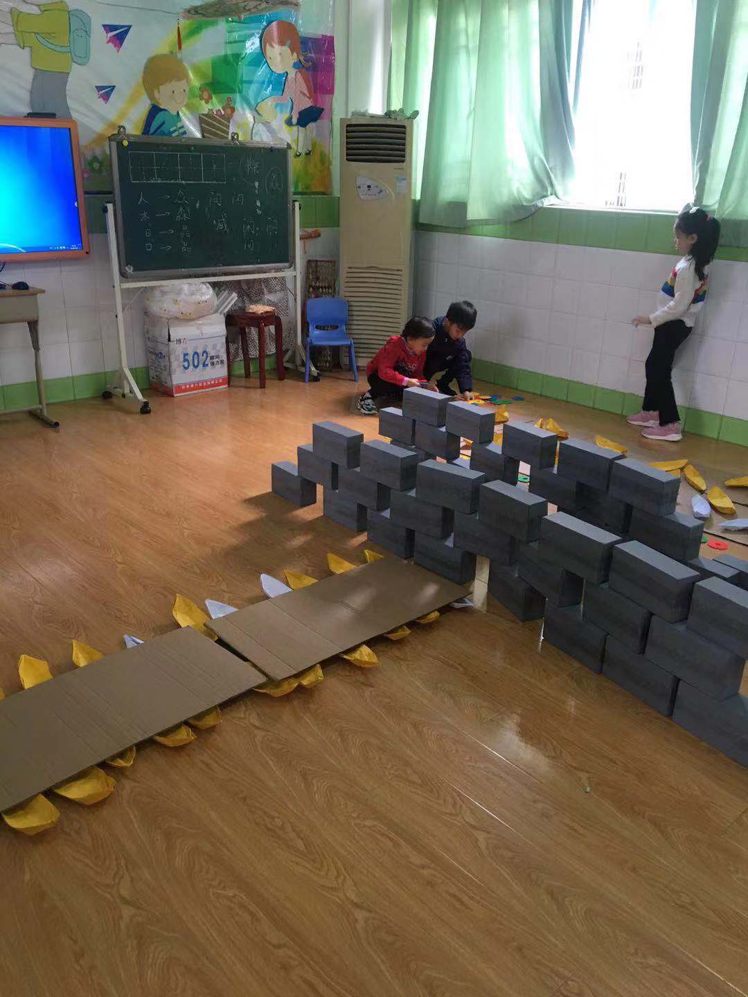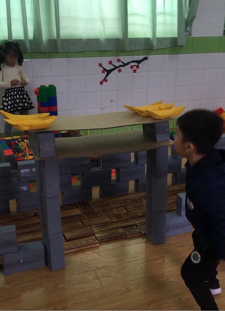 这是一个连续性的合作性游戏,在其中,幼儿自主地发展着建构能力,从简单的架空搭建城墙再到镶嵌大树,幼儿的建构能力在不断的提高,古城墙看似简单,实则是对称、平铺、间隔排列和镶嵌等多种建构经验的综合运用。