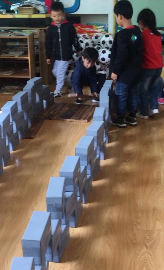 宋城文化历史悠久,为了让孩子们更加了解古城文化,我们开展了《品古城文化——走进赣州古城墙》的亲子活动,孩子们游览了古城墙,对古城墙文化与构造非常感兴趣,因此,在建构区内,我们提供了许多规格统一的长方形纸盒子、碳烧积木和积塑等,于是,他们开始了搭建古城墙活动。