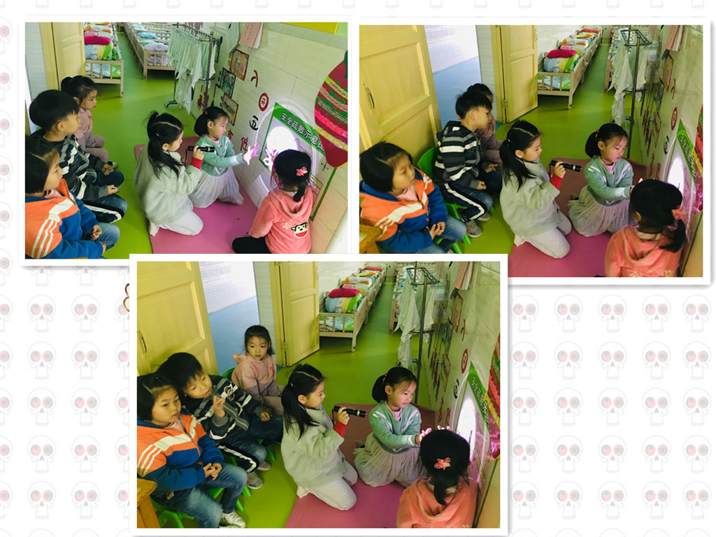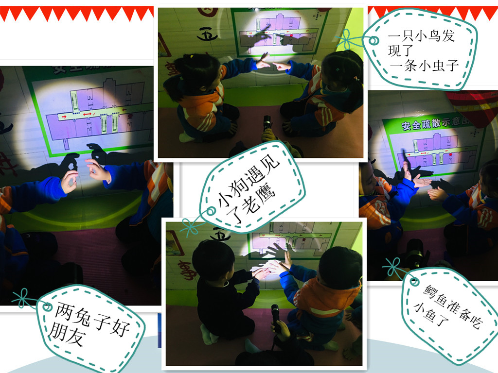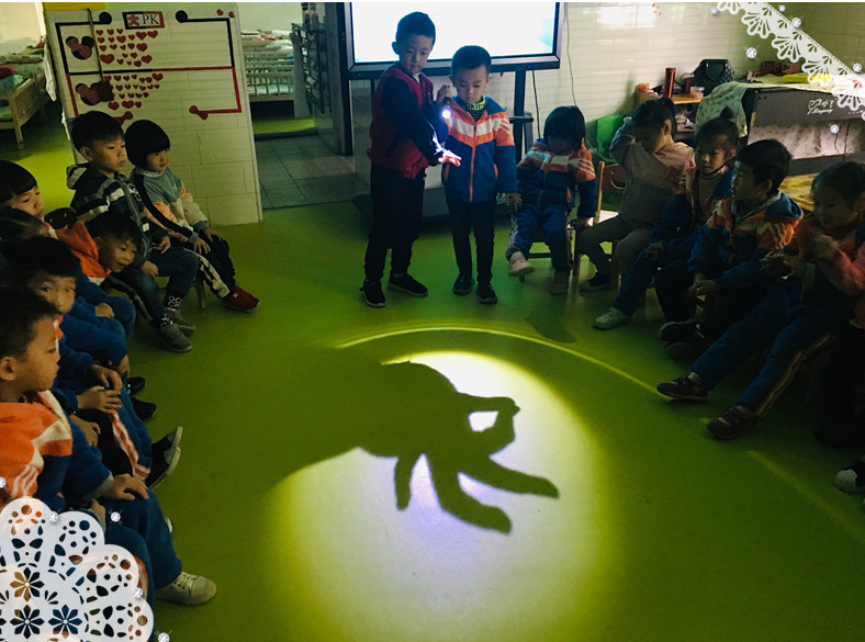 孩子们发现和观察到了阴天没有影子,这引起了大家浓厚的探究兴趣。 孩子们在探究中认识周围的事物和现象,能通过观察、比较与分析教室里的灯、手机、手电筒照出影子,发现并描述其特征和前后的变化,最后创设了区域游戏影子小剧场。
