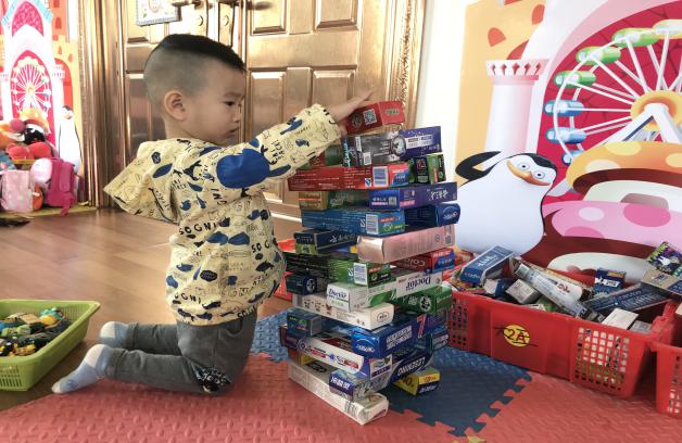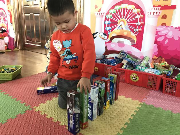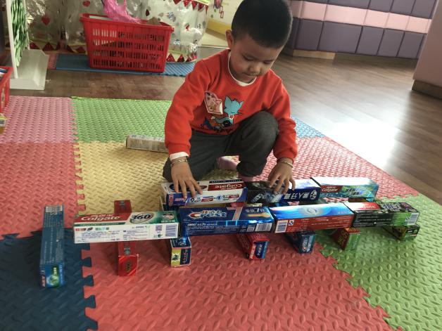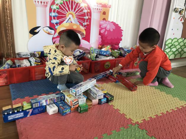 皮:我们在旁边搭一辆车好不好?(边说边从旁边的框里拿出两个更长的牙膏盒重叠放在“马路”旁)