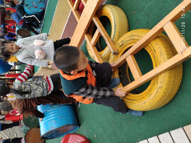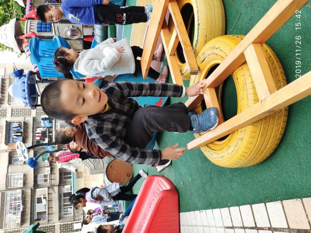 11月4日孩子们在玩走楼梯的游戏。他们动手搬来了木楼梯,滚来了大轮胎。用轮胎做桥墩,用木楼梯做桥面,很快就分组搭好了四座楼梯小桥。