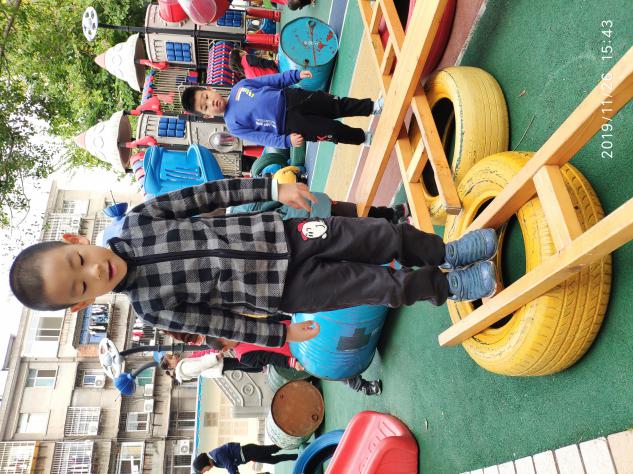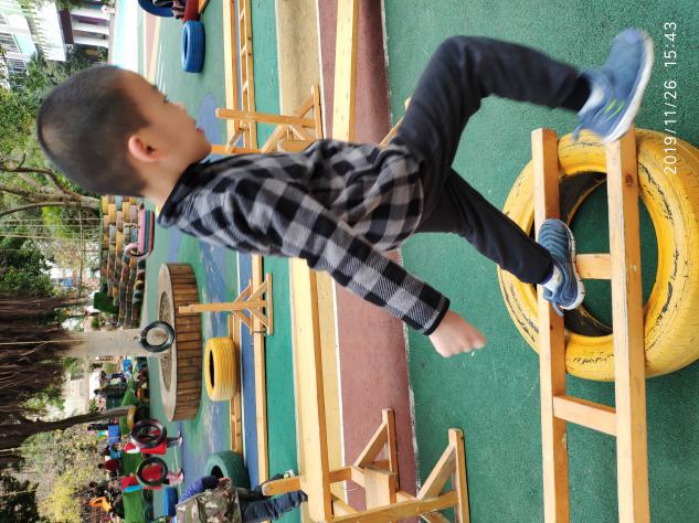 11月24日户外自主游戏老师发现张轩诚已经能熟练地一脚踩上楼梯,双手协调平衡,两脚交替快速地迈步走在楼梯中间的横档上。到达终点以后单脚起跳,双脚落地跳下楼梯。