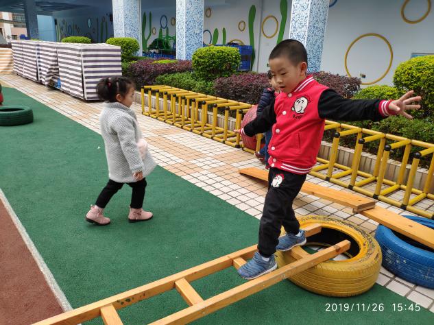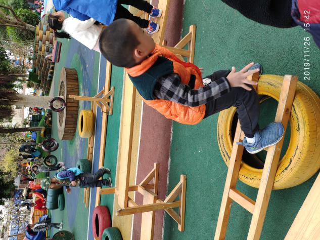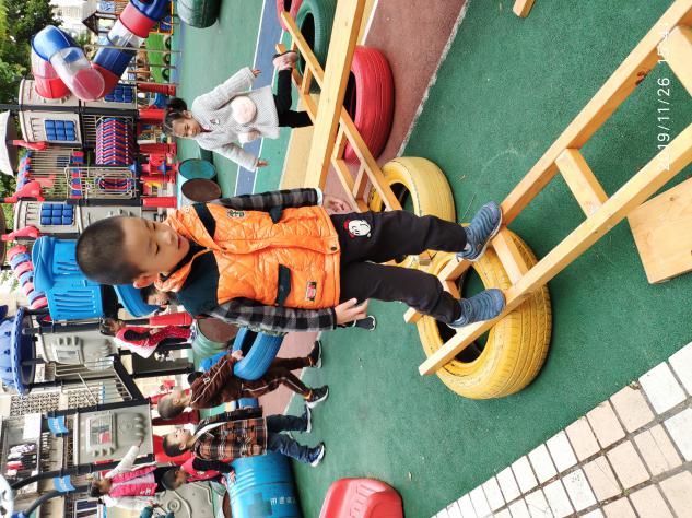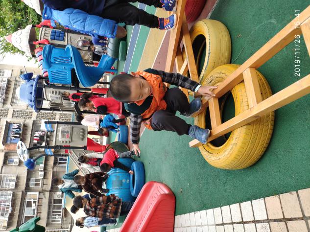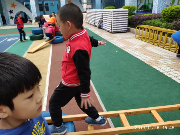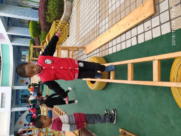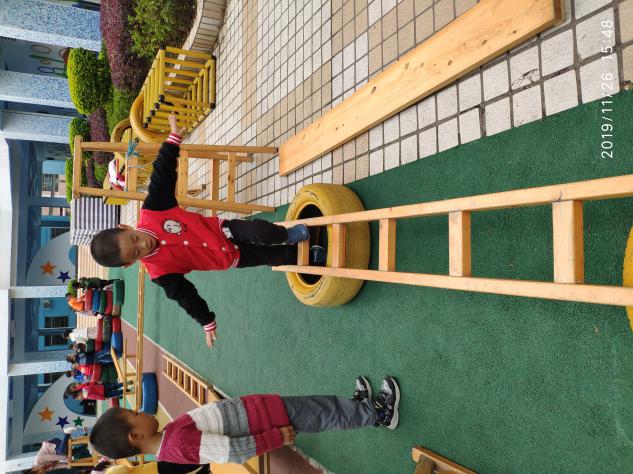 11月14日晨间活动孩子们又再次玩走楼梯的游戏,男孩子们都是一脚踩在楼梯中间的横档,站上楼梯之后,从楼梯的横档上迈步快速的通过小桥。有的孩子还能快速的跑过楼梯了。