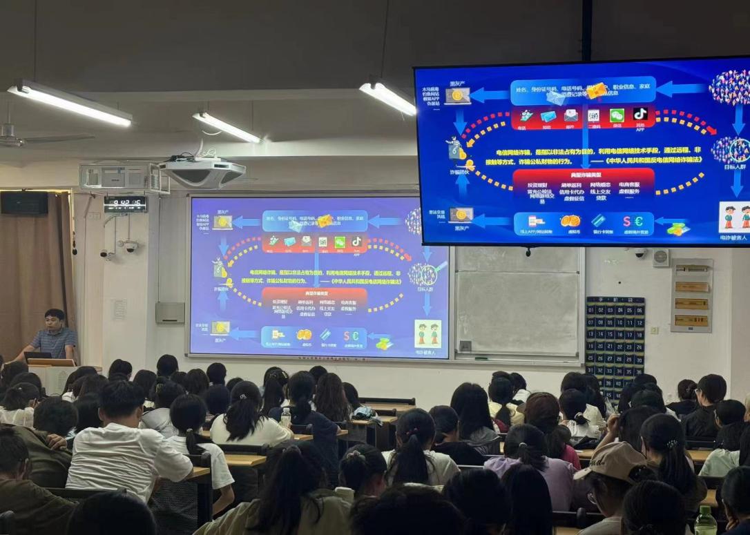 赵警官凭借其丰富的专业知识和反诈经验,从当前社会常见的电信诈骗类型、防诈金融知识以及消费者权益保护三个方面进行详细讲解,通过实际案例展示了诈骗分子如何利用各种手段诱骗受害者上当受骗。同时,赵警官通过提问和解答的方式,加深学生们对反诈知识的理解和记忆,传授一系列实用的防范电信诈骗的技能。
