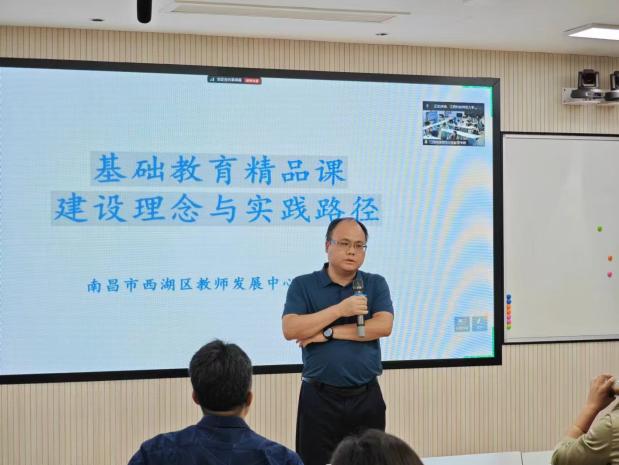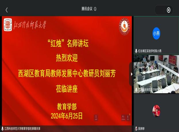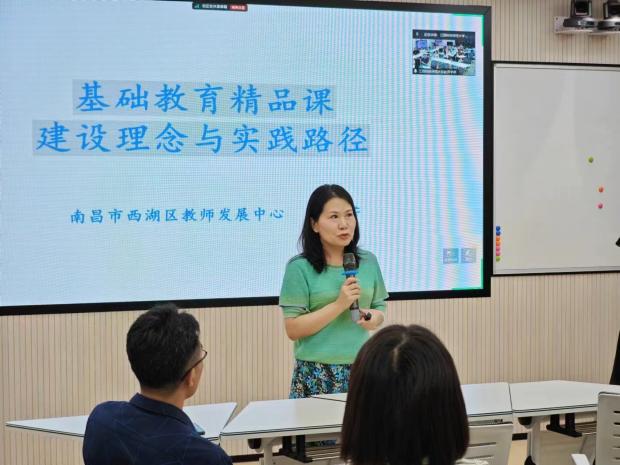 研讨会邀请西湖区教育局教师发展中心教研员、省级精品课一等奖指导教师刘丽芳做《基础教育精品课程建设理念与实施路径》专题讲座,介绍基础教育精品课程建设的内容和方法,重点分析精品课程评比标准及达成形式。讲座由教育学院副院长刘雁伶主持,学校教务处副处长、协同提质专干余志科出席,各师范专业协同提质对接老师、红谷实验学校和红岭小学协同提质精品课负责人参与学习。