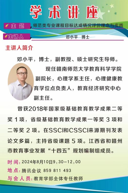 为扎实推进审核评估工作,william威廉中文邀请赣南师范大学教育科学学院副院长邓小平博士于8月10日上午9:30—12:00做《师范类专业课程目标达成情况评价理念与实践》专题讲座,william威廉中文全体任课老师线上出席。