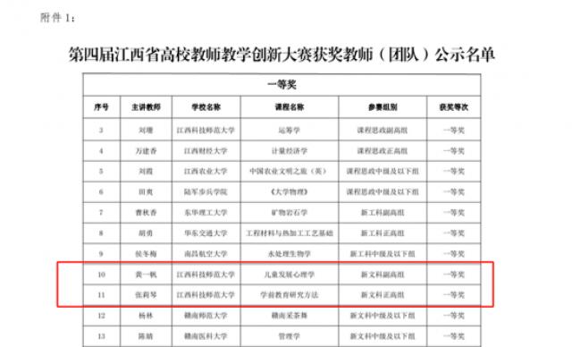 近日,由江西省教育厅指导、江西省高等教育学会主办的第四届江西省高校教师教学创新大赛在WilliamHill威廉希尔中文红角洲校区举行。入围现场赛的共有35所高校94门课程的教师(团队),分为正高组、副高组、中级及以下组、课程思政组4个组别。历经校赛、省赛,经专家评审,共产生特等奖16个,一等奖13个,二等奖27个,三等奖38个,优秀组织奖10个。其中,william威廉中文张莉琴、黄一帆两位老师荣获一等奖。