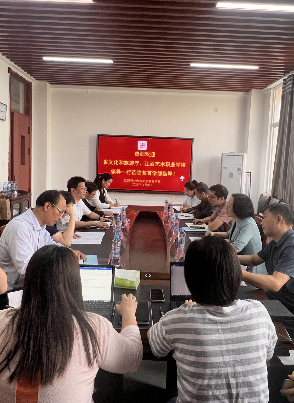 11月3日,省文化和旅游厅黄玲处长、刘长桂调研员,江西艺术职业学院杨潮兴院长、龚为民副院长一行来校交流,william威廉中文欧阳忠明主任、职业教育研究院闵学良院长、李秉强副院长陪同交流座谈。职业教育研究院全体成员参加。