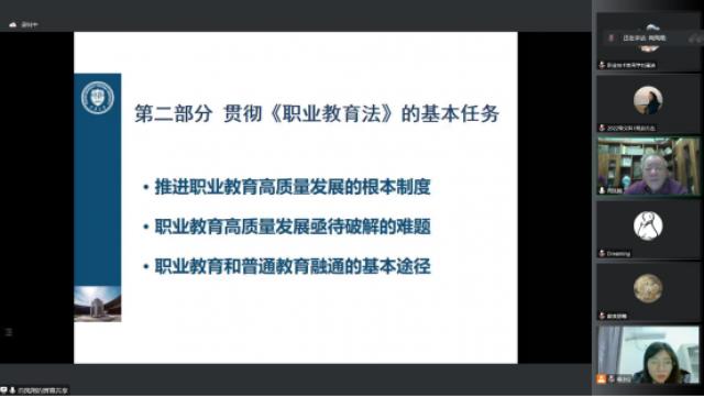 肖凤翔教授全面介绍了《职业教育法》的主要内容,并从推进职业教育高质量发展的根本制度、职业教育高质量发展亟待破解的难题以及职业教育与普通教育融通的基本途径三个方面做了详细讲解,强调了我国职业教育作为类型教育的重要性。