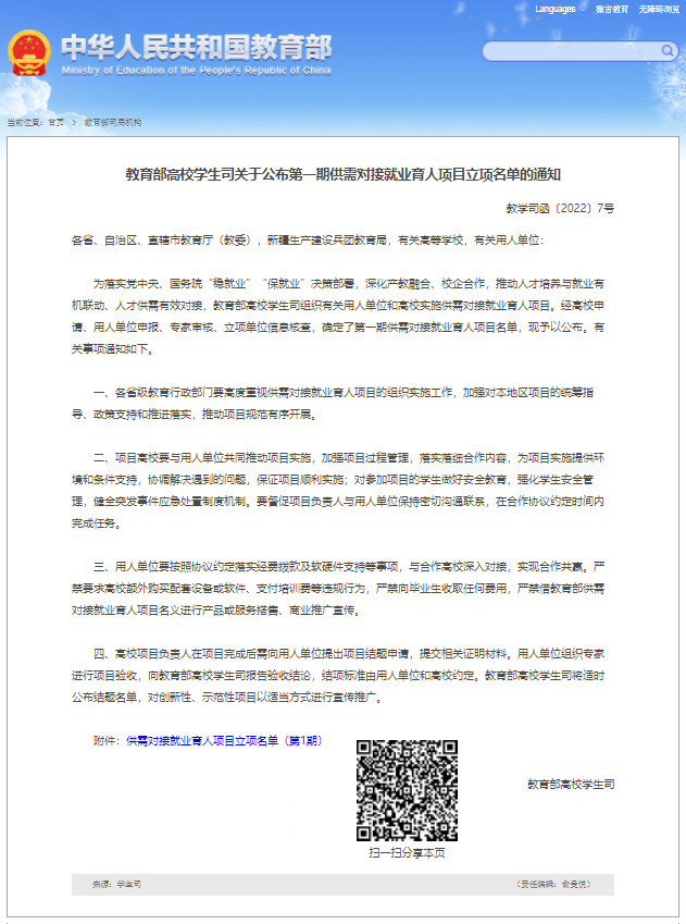 据悉,为落实党中央、国务院“稳就业”“保就业”决策部署,深化产教融合、校企合作,推动人才培养与就业有机联动、人才供需有效对接,教育部高校学生司组织有关用人单位和高校实施供需对接就业育人项目。供需对接就业育人项目分为定向人才培养培训、就业实践实习基地建设、人力资源提升三类。其中,就业实践实习基地建设项目由高校与用人单位共建就业实践实习基地,为高校毕业生提供实习岗位,帮助毕业生通过实习实现就业。人力资源提升项目由高校和用人单位建立定向合作关系,共建人才工作站或专门人才基地,建立紧密的人才供需对接关系。