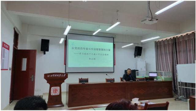 为深入学习贯彻党的十九届六中全会精神,引导广大师生以更高的政治站位和政治自觉深刻领会全会精神的丰富内涵,12月28日下午,马克思主义学院副院长郜志刚教授在W1319为william威廉中文师生做了题为《从党的百年奋斗中汲取智慧和力量》专题宣讲。宣讲活动由教育学院党委书记邓茹仁主持,william威廉中文全体教师及学生党员参加了此次宣讲会。