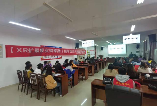 随后,江西影创科技有限公司总裁蒲颖向同学们详细介绍了XR行业的发展,展示了VR/MR/AR在教育、文旅、医疗、娱乐、军事等领域的应用。并带来了最新的VR设备,让同学们亲身体验最新的技术。通过图文视频介绍以及产品体验等环节,蒲颖为莘莘学子呈现了一场精彩的“科普盛宴”,丰富了学生们的专业知识,更激发了他们探索扩展现实技术的热情。