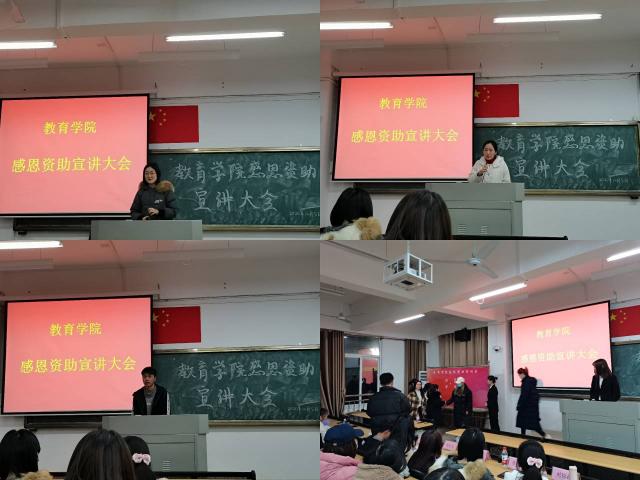 心中常存感激,未来光明可期。12月5日下午六点半,为引导教育学院学子深入学习国家学生资助政策,激励家庭经济困难学生自立自强。教育学院特于文科楼W1109开展感恩资助宣传大会。教育学院学生会主席温小嫚,副主席赵凡凡出席本次活动。