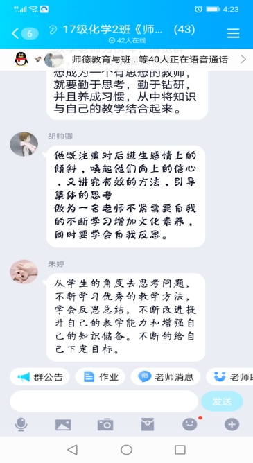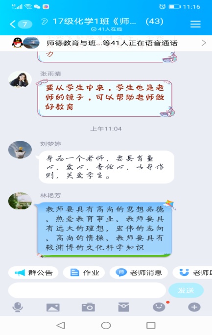 教学过程中,我院教师充分发挥线上教学的优势,与学生积极开展互动讨论,及时为学生答疑解惑,培养学生独立思考能力。任课教师开课以来,线上教学运行平稳,有声有色,教学效果良好。《学前儿童艺术教育》、《教育技术学》、《师德教育与班主任工作》等课程或课程团队教师,依托自己团队已建立的慕课资源,课前教师集体网络备课,给学生发送学习任务单,课程中充分发挥线上教学平台的优势和便利,采用签到、任务闯关、随堂测试等形式,广泛调动学生学习的热情和积极性,课后布置作业,保障学生及时高效完成学习任务,授课效果良好。