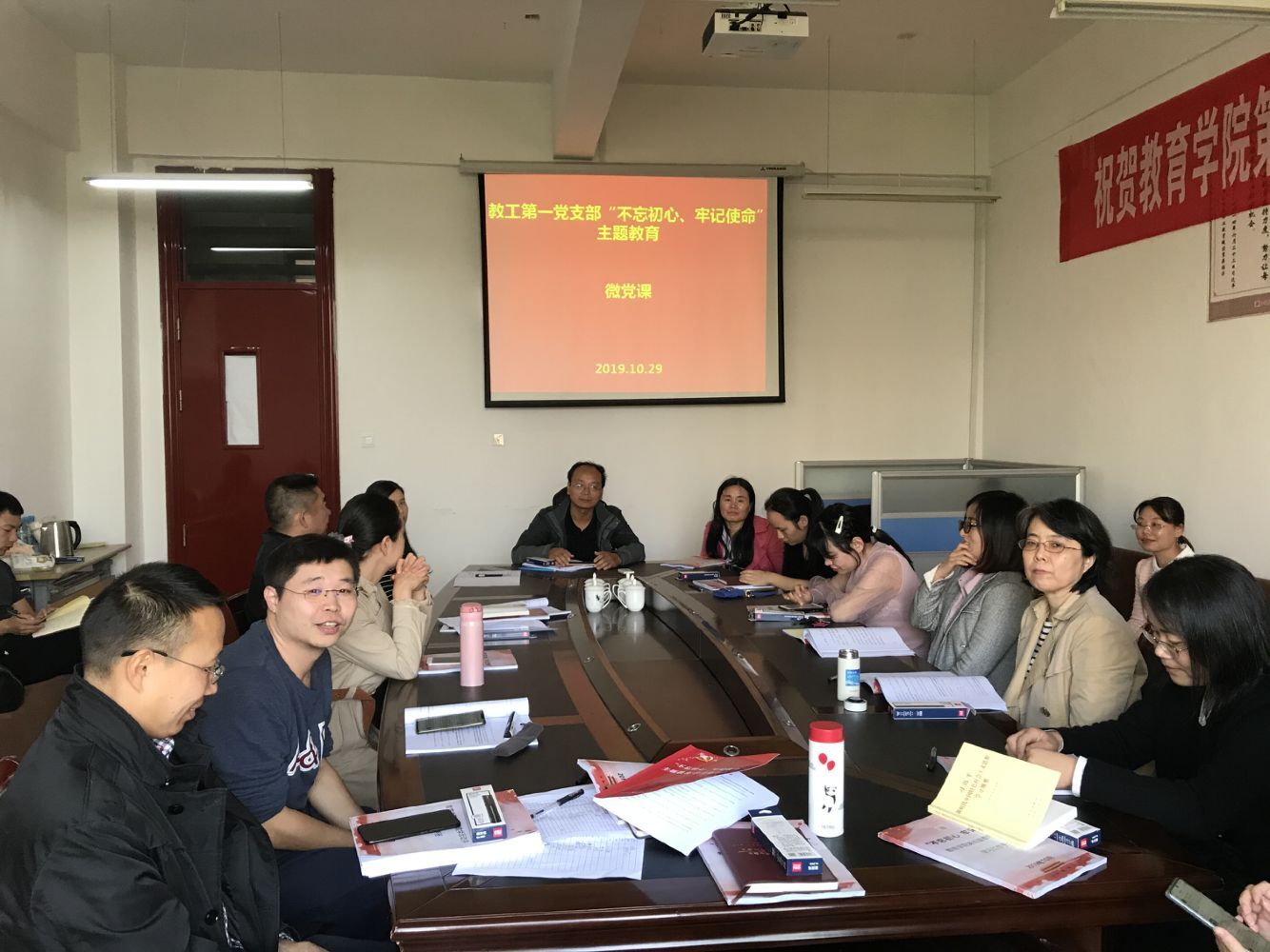 2019年10月29日下午,按照学院开展“不忘初心、牢记使命”主题教育部署,以及教育学院教工第一党支部学习计划,由路海萍书记主持教育学院教工第一党支部全体党员继续集中学习,及组织全体党员开展围绕如何发挥党员先锋模范作用为专题的微党课活动。每位党员都结合自身的学习体会及教学实际分享了感受与心得。