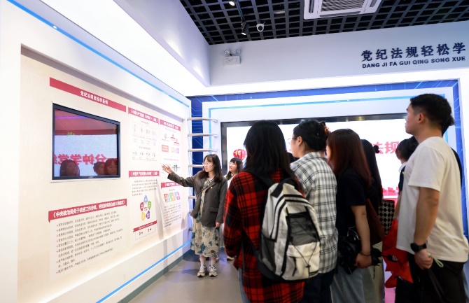在参观过程中,全体党员重温入党誓词,表达对党的忠诚和决心,随后依次参观“说文解字”、“廉史大讲堂”、“先贤解惑”、“百家论廉”、“党纪法规轻松学”等廉文化、廉知识、廉元素展区。体验馆内以智能语言、VR、AI等高科技设置的廉政互动项目,从互动项目中受到教育和警示,重温《中国共产党廉洁自律准则》部分摘录,全体朗读“廉洁三字经”,切实把学纪、知纪、明纪和守纪贯通起来,自觉学纪、准确知纪、心中明纪、严格守纪。
