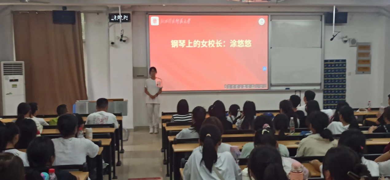 9月12日,教育学院在新生入学教育中开展在W1109学院优秀校友宣传。请到2009级教育技术优秀校友,全国优秀教师,被誉为钢琴上的女校长:涂悠悠