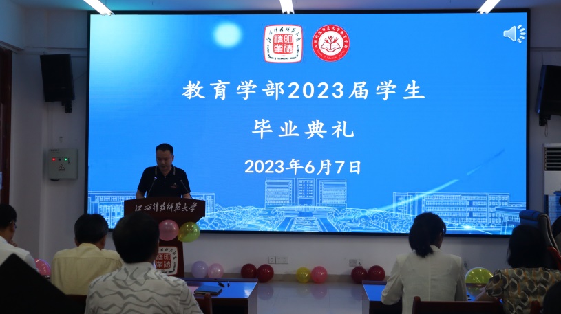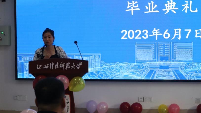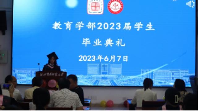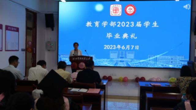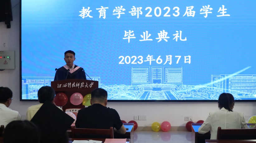 2023届职业技术教育学研究生刘涵滨、学前教育专业本科生卢莹作为优秀毕业生代表先后发言。他们回忆了自己在学院的求学经历,表达了对学院、学校深深的感激之情。