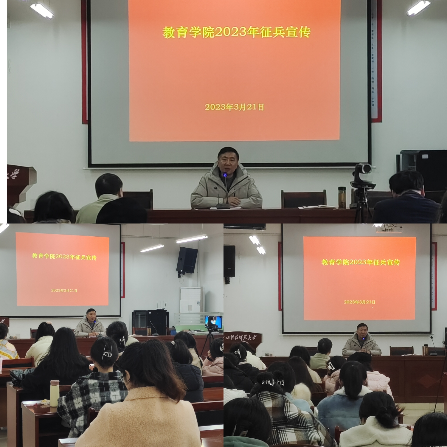 为加强征兵政策宣传,进一步贯彻落实国家大学生征兵入伍政策,激发大学生参军入伍热情,鼓励和引导在校大学生积极参与应征入伍,3月21日下午,教育学院在w1319会议室开展国家征兵政策宣讲会,宣讲会由学院学工办主任曹瑜主讲,教育学院各年级学生代表、部分辅导员班主任参加了本次宣讲。