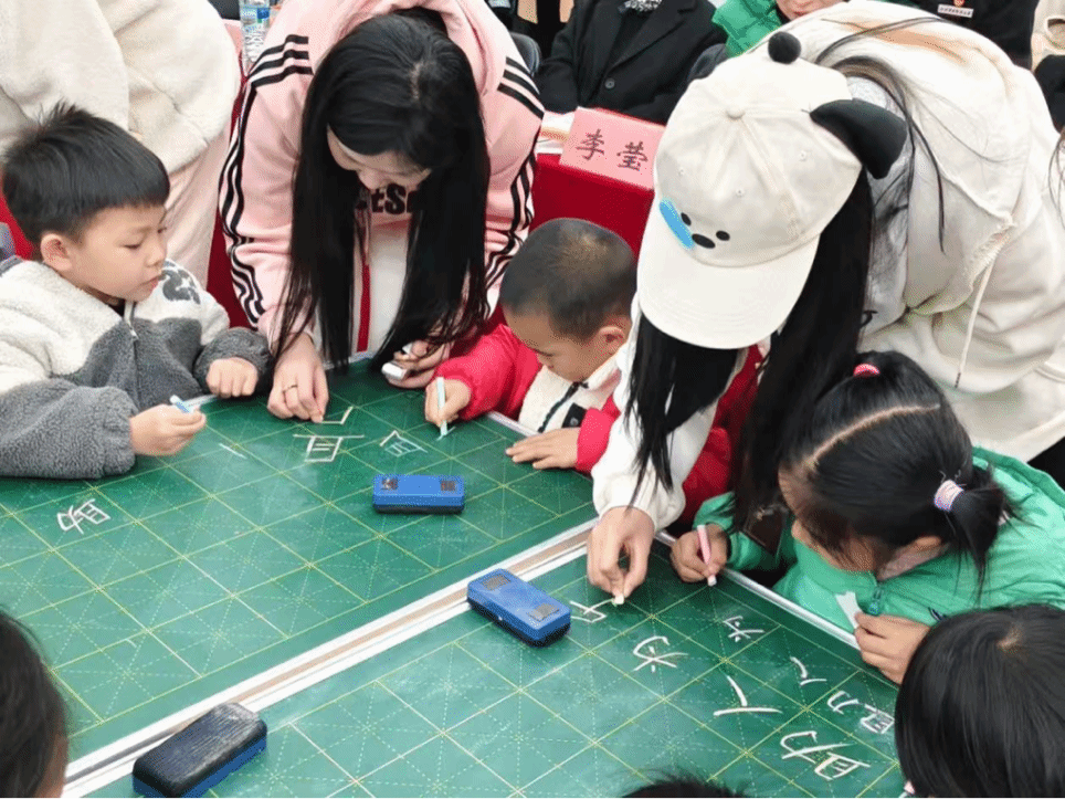 学前教育的“小老师”们以动画故事导入进行雷锋精神童趣宣讲并开展《学习雷锋好榜样》歌曲学唱。随后,幼儿在“小老师”们的引导下通过触摸认识毛笔、粉笔、中性笔等趣味工具,并借助毛笔涂绘“爱心树”、粉笔大地画“雷锋行动”、中性笔书写“温暖字”等活动参与三笔字体验。