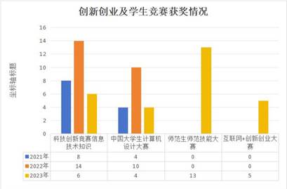 在专业教师的指导下,学生们在专业知识和实践能力等方面得到全面提升,同时,教育技术学专业的参赛项目广泛,近三年来获得七十余项国家级、省级奖项,获奖覆盖面达到20.83%。如本专业学生在创新创业及学科竞赛方面,在江西省大学生科技创新竞赛的信息技术知识赛中三年来分获28个省级奖;在中国大学生计算机设计大赛中三年来分别获18个国家级、省级奖;在师范技能大赛中2023年获13个校级奖;在互联网+创新创业大赛中2023年获5个国家级、省级奖等。